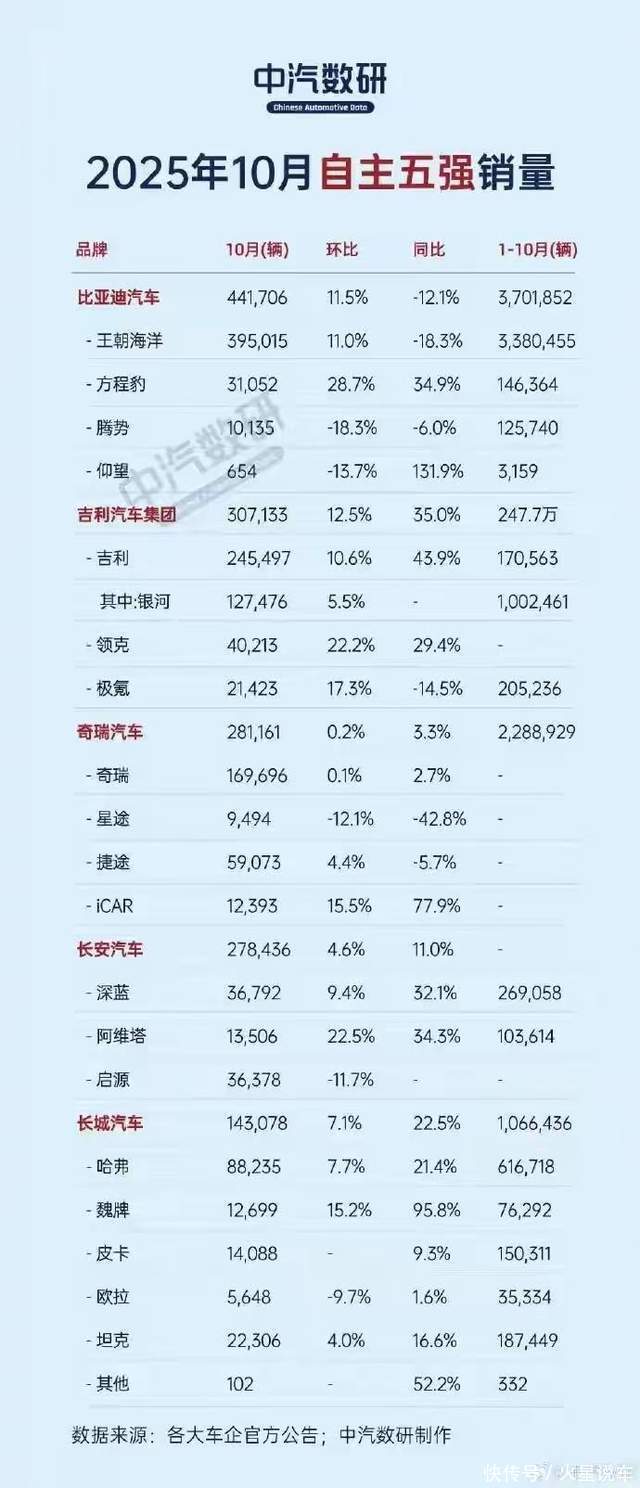 威力财 自主“五强”10月销量:比亚迪同比下滑12.1%,吉利成最大黑马