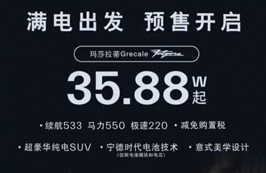 这款车就是玛莎拉蒂Grecale格雷嘉 Folgore,该车定位超豪华纯电中型SUV,售价89.88万元,看上去有点高不可攀和遥不可及,但实际上,这款车的价格仅为35.88万元,相当于优惠了54万元。这样一来,玛莎拉蒂Grecale格雷嘉 Folgore的实际价格就和小米YU7、特斯拉Model Y差不多了。为了提升销量,玛莎拉蒂真的豁出去了!